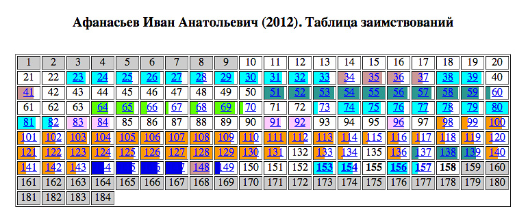 В таблице выявленных заимствований оранжевым по белому выделяется кусок из 40 страниц, полностью или частично совпадающих с текстом работы Фадеевой, упоминание которой есть только на 103-й странице, последующие же 30 ее почти дословно цитируют. «Текст совпадает дословно на сорока страницах подряд с заменой слов «ипотека» на «строительство» — это вовсе не плагиат, так как хотя автор формально имеет совпадения с чужими работами, но научая мысль у него была совсем другая.